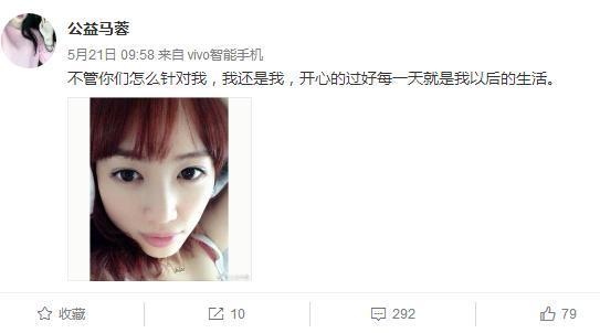 馬蓉從來沒有正式接受過媒體記者的采訪,曾有記者要采訪,也吃了閉門羹。但是她從5月19日開始,連續(xù)更新了八條微博,表示十分強(qiáng)勢(shì),懟王寶強(qiáng),懟網(wǎng)友,一副正大光明的樣子。