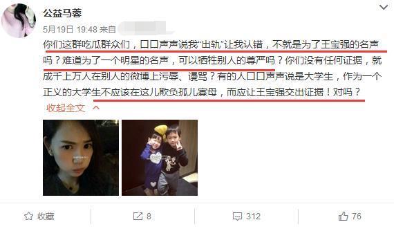 5月19日晚上7點(diǎn)48分,馬蓉發(fā)布微博,指責(zé)網(wǎng)友:你們這群吃瓜群眾們,口口聲聲說我“出軌”讓我認(rèn)錯(cuò),不就是為了王寶強(qiáng)的名聲嗎?難道為了一個(gè)明星的名聲,可以犧牲別人的尊嚴(yán)嗎?你們沒有任何證據(jù),就成千上萬人在別人的微博上污辱、謾罵?有的人口口聲聲說是大學(xué)生,作為一個(gè)正義的大學(xué)生不應(yīng)該在這兒欺負(fù)孤兒寡母,而應(yīng)讓王寶強(qiáng)交出證據(jù)!對(duì)嗎?