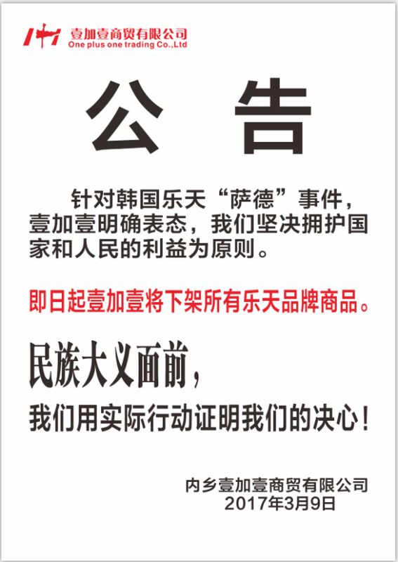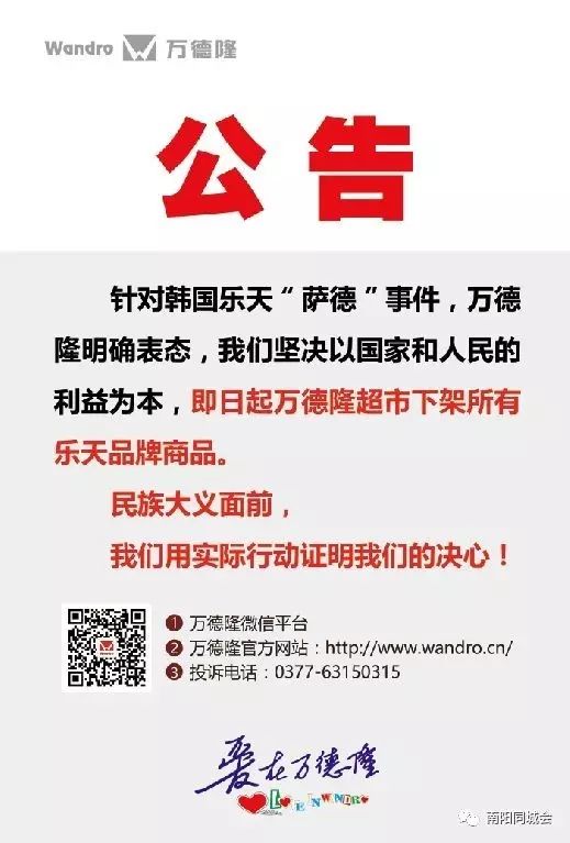 因韓國(guó)薩德事件持續(xù)升級(jí) 中韓關(guān)系進(jìn)一步僵化 已嚴(yán)重傷害中國(guó)人民的利益和感情 南陽(yáng)各大超市作為本土企業(yè) 以國(guó)家和人民利益為本 已全面禁止出售韓國(guó)樂天產(chǎn)品 南陽(yáng)萬德隆、盛徳美、大統(tǒng)百貨、金瑪特、內(nèi)鄉(xiāng)壹加壹等全面下架所有樂天系列產(chǎn)品! |